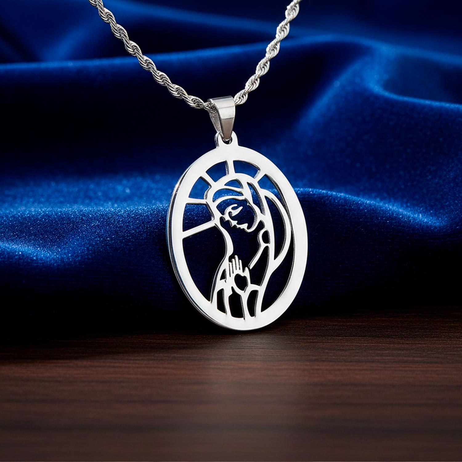 Dije religioso en acero inoxidable con imagen sagrada. Una medalla resistente de acabado pulido, símbolo de fe y protección duradera.