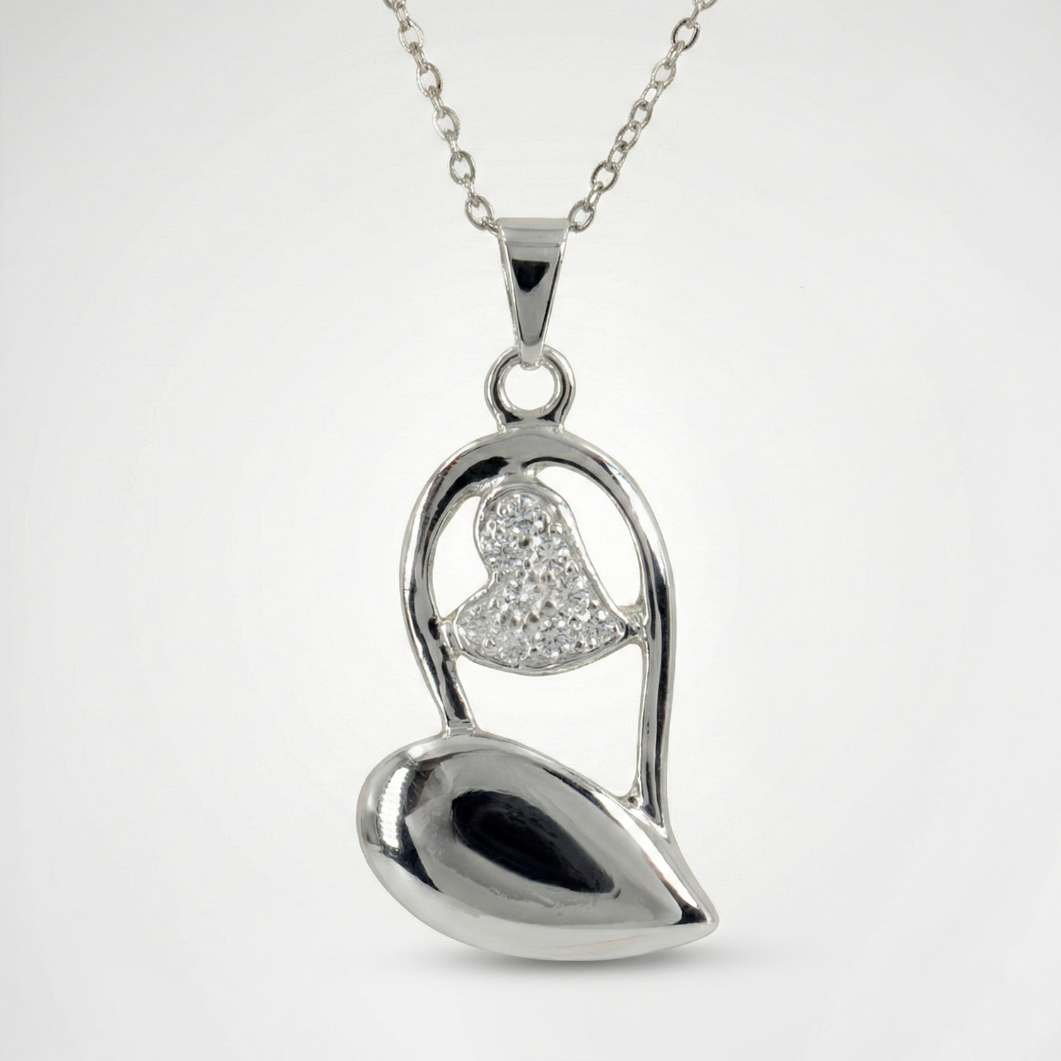 Dije en plata 925 con diseño abstracto y corazón cortes diamantados. Una pieza moderna y pulida que aporta brillo y un toque romántico a tu look.