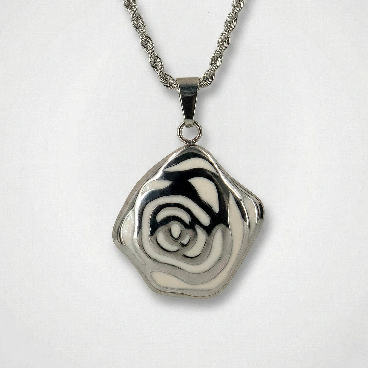 Dije de rosa estilizada en acero inoxidable con detalles en resina blanca. Un diseño floral moderno y resistente, ideal para un look femenino y sofisticado.