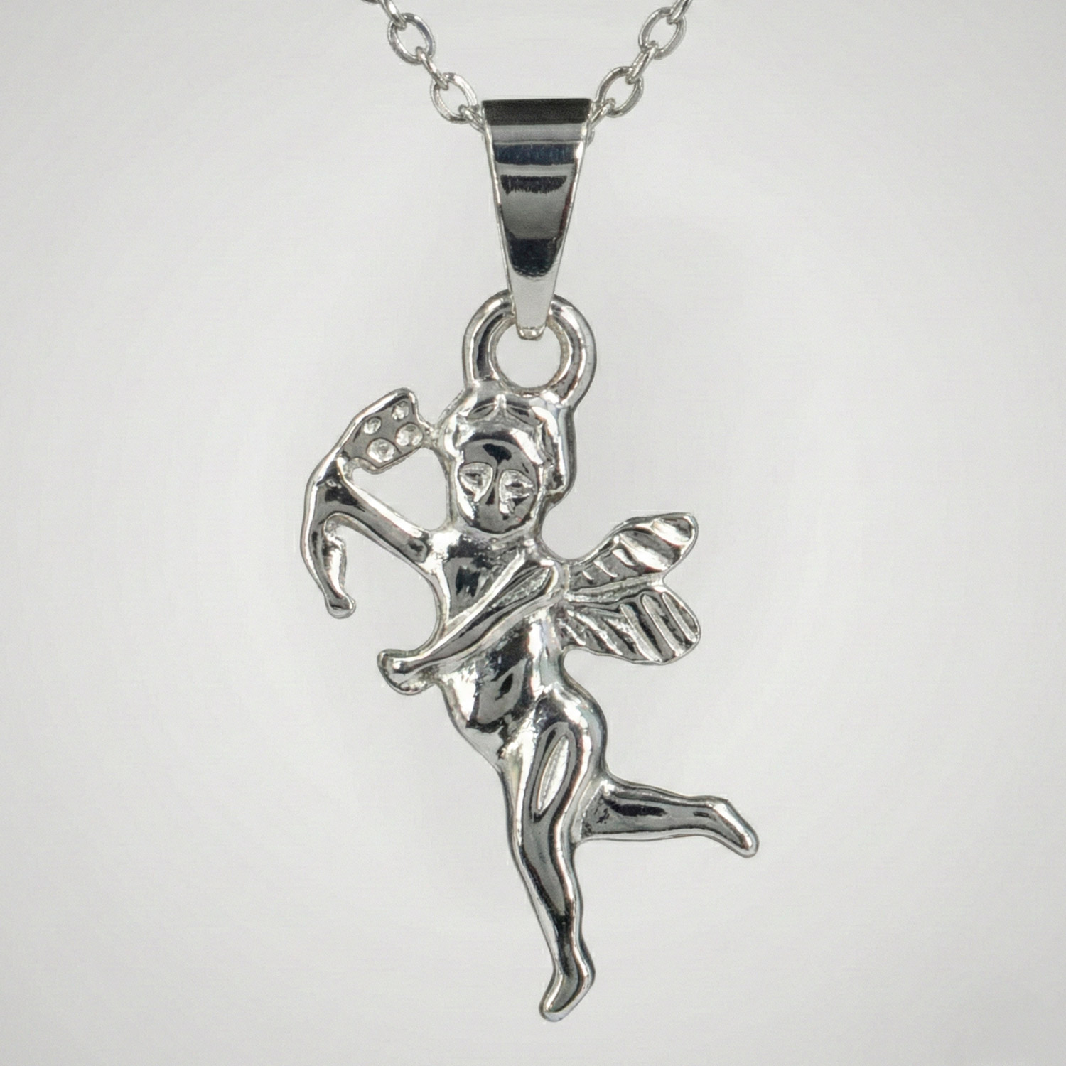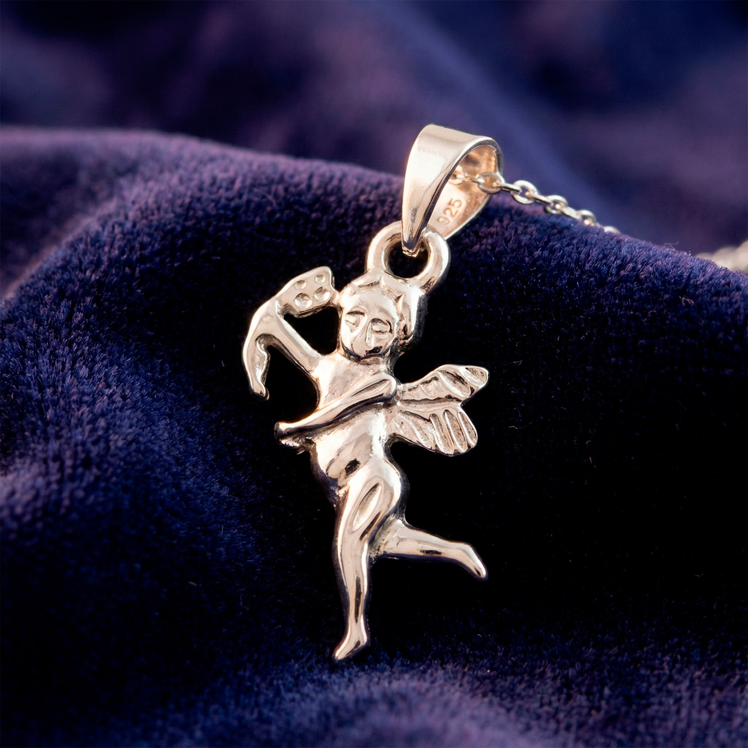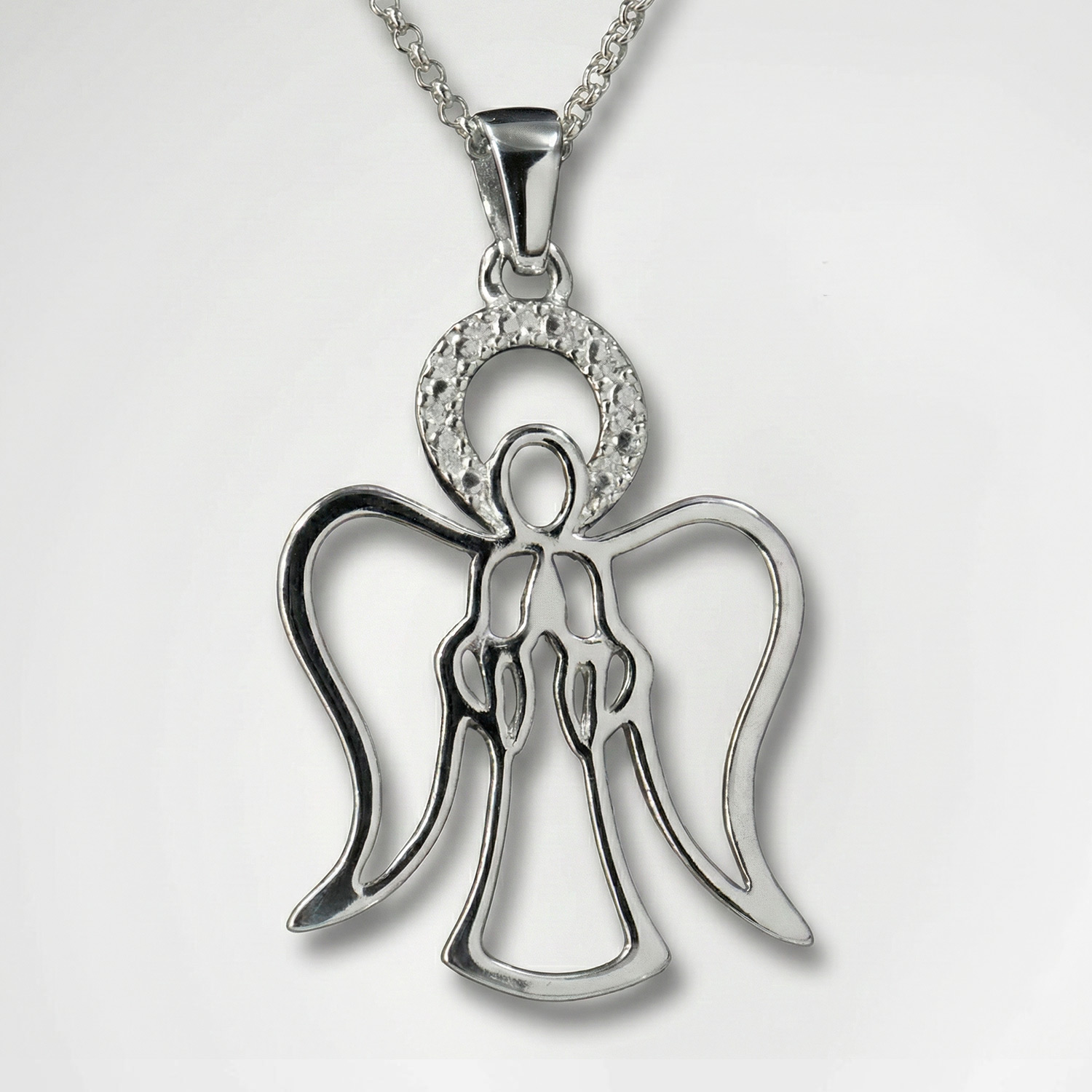 Conjunto de dije de ángel y cadena en plata 925 con acabado diamantado. Un símbolo de protección que ofrece un brillo intenso y texturizado sin necesidad de piedras.