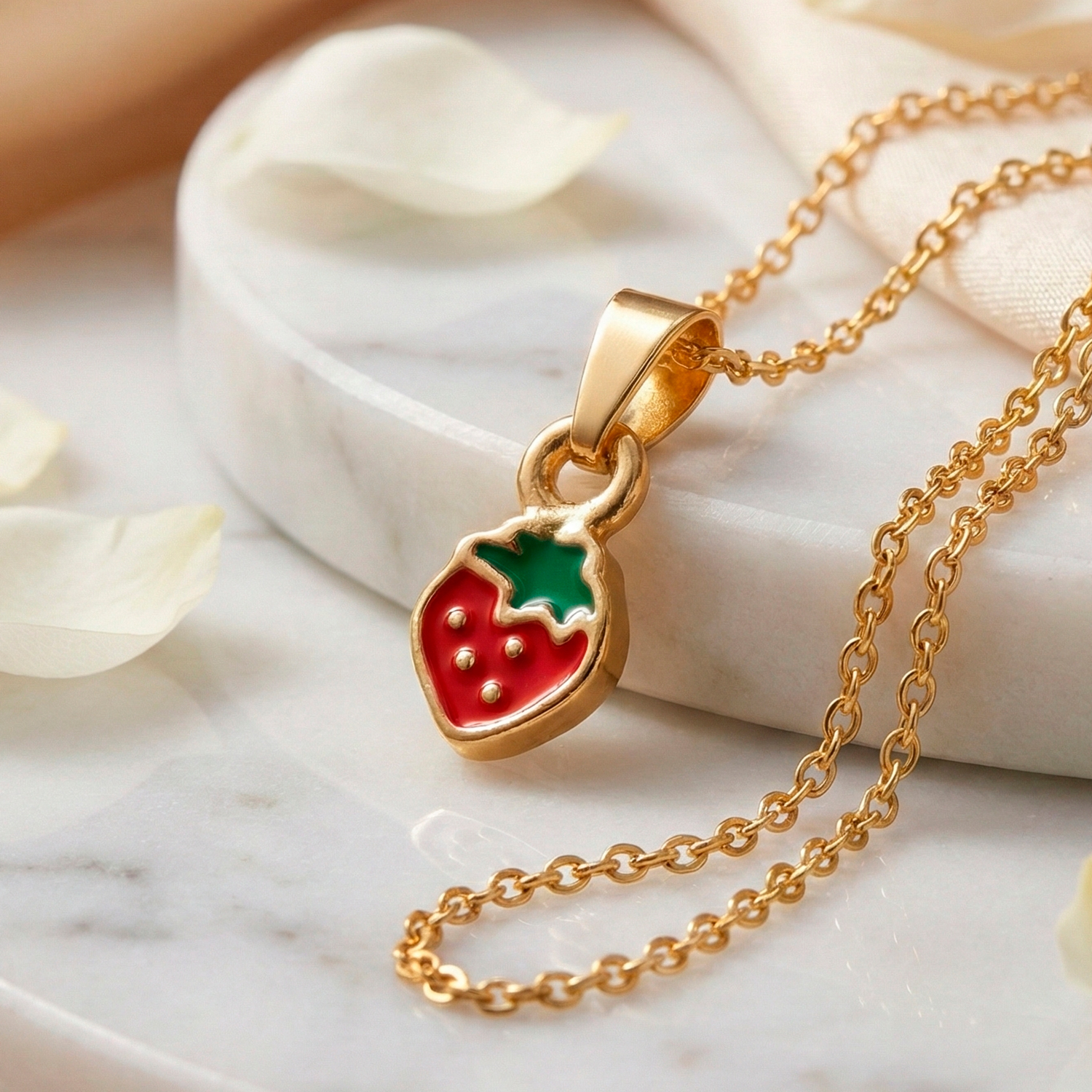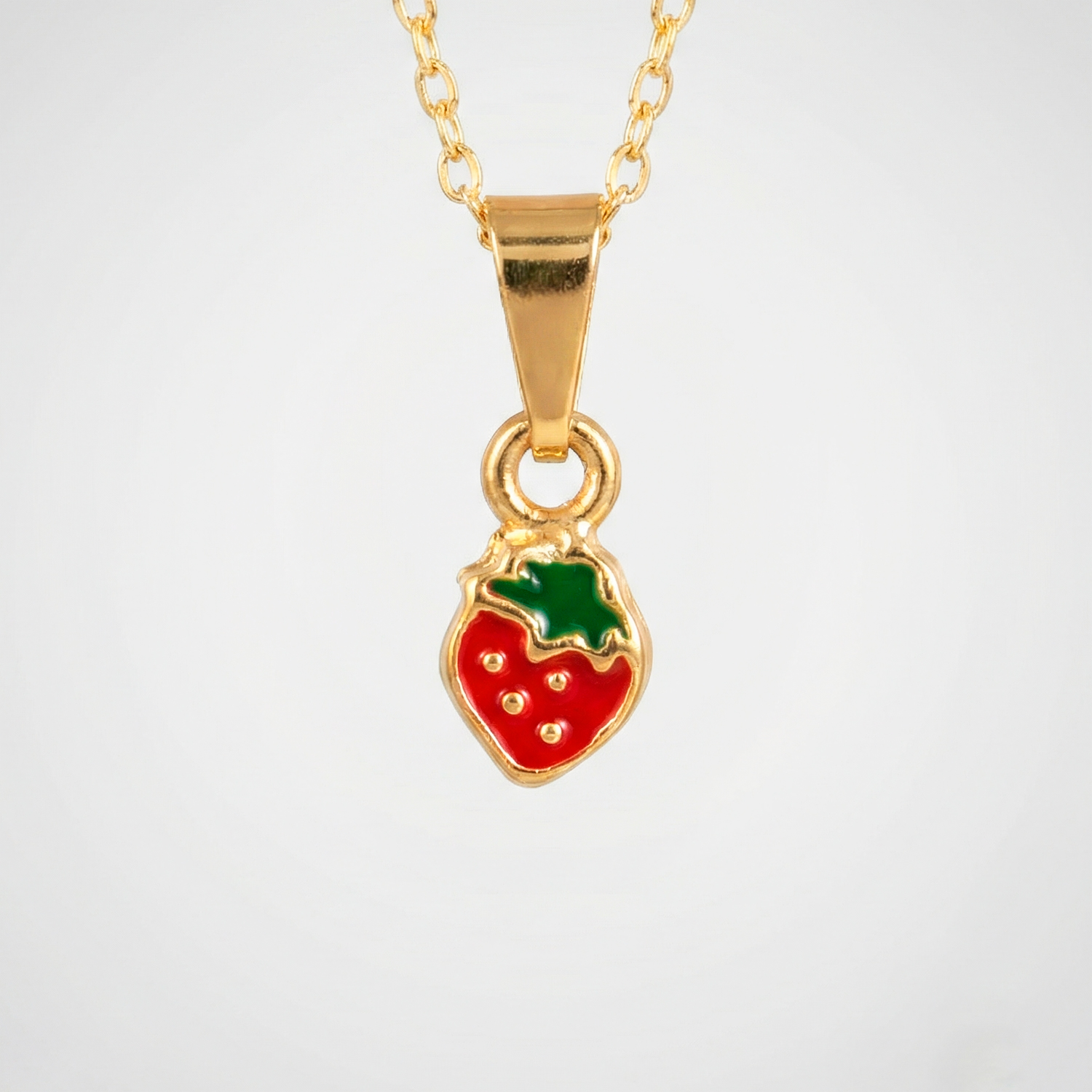 Dije de frutilla enchapado en oro con detalles de resina roja y verde. Un diseño dulce y colorido, perfecto para un estilo fresco y divertido.