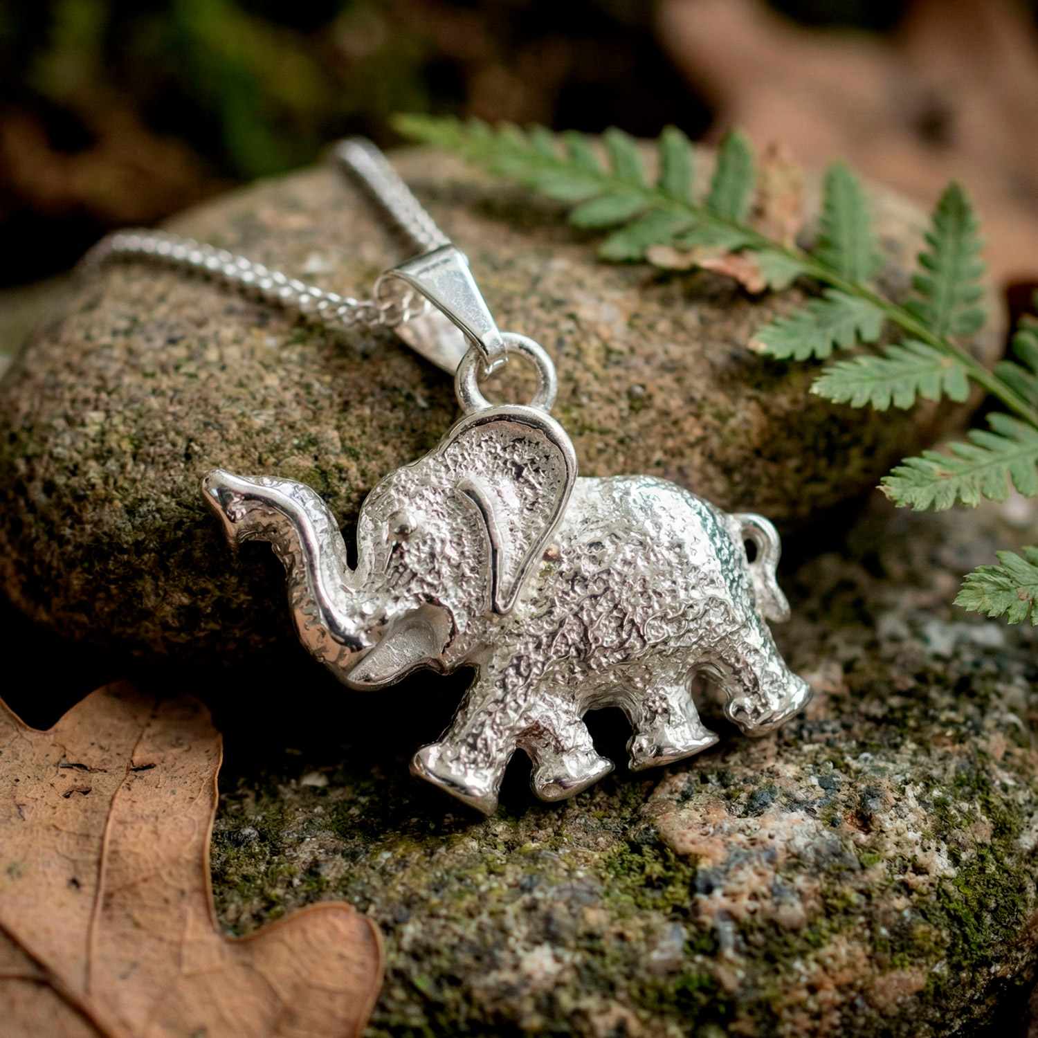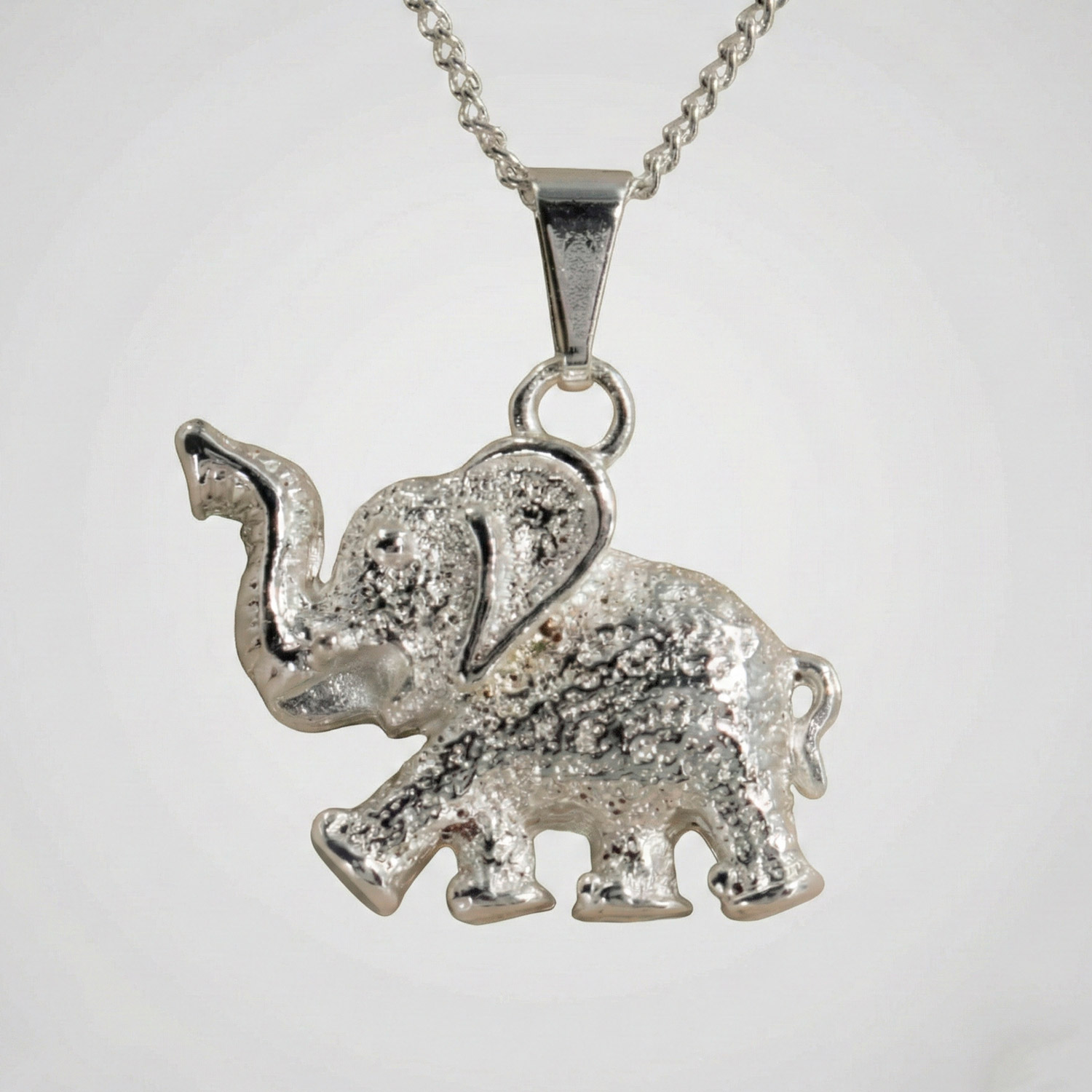 Dije de elefante en plata con acabado brillante. Un símbolo de suerte y sabiduría, ideal para llevar como amuleto diario con estilo.