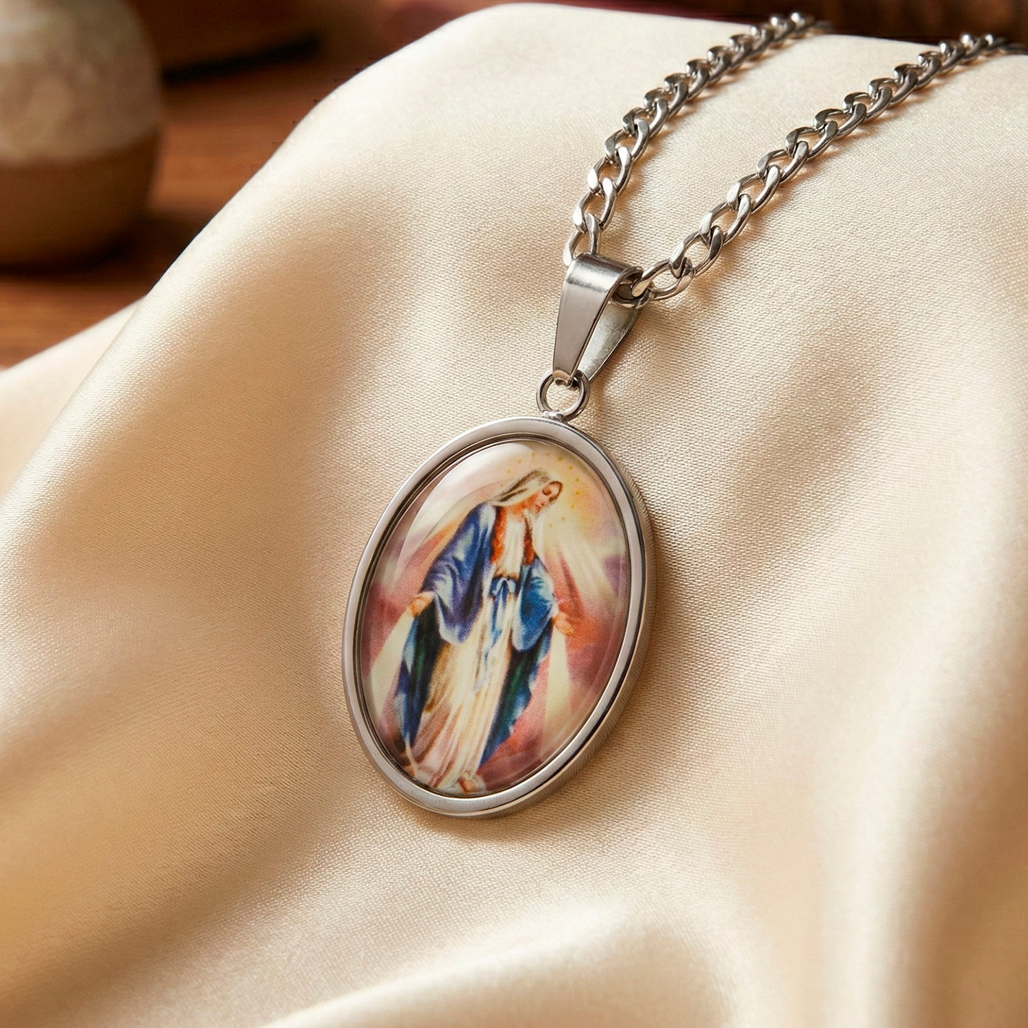 Dije religioso en acero inoxidable con imagen sagrada. Una medalla resistente de acabado pulido, símbolo de fe y protección duradera.