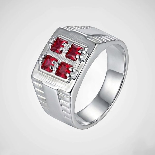 Define tu carácter con este imponente anillo sello enchapado en plata 925. Presenta un centro geométrico con cuatro circones rojos vibrantes de corte cuadrado, acentuados por texturas laterales en la banda. Una joya robusta que combina fuerza y sofisticación clásica para un look distinguido.