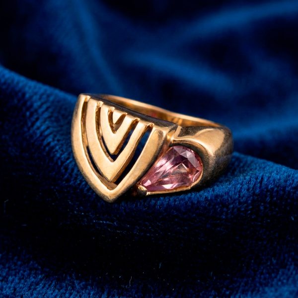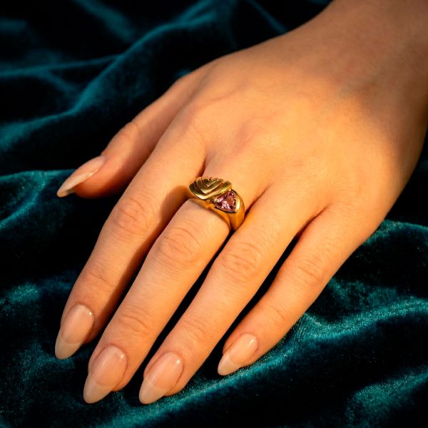 Anillo enchapado en oro con circón rosa y diseño lateral calado. Una pieza moderna y geométrica que aporta un brillo vibrante y sofisticación audaz a tu mano.
