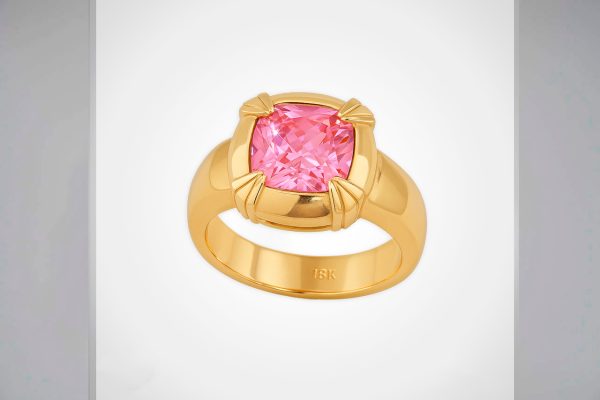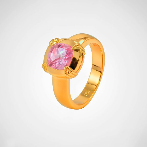 Este anillo enchapado en oro destaca por su deslumbrante diseño y su imponente presencia. Su estructura pulida sostiene una piedra central rosa de corte cojín, intensamente brillante, asegurada por cuatro engastes robustos en forma de garra que evocan fuerza y estilo. La combinación del tono dorado con el brillo vibrante del zircon rosa crea una pieza que refleja sofisticación y feminidad con carácter.