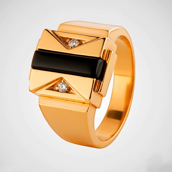 El anillo Black Edge, parte de la colección Obsidian Geometry, destaca por su estructura geométrica moderna y sus contrastes audaces. Fabricado en aleación con baño de oro de 18 quilates, su diseño arquitectónico presenta una piedra negra rectangular incrustada al centro, flanqueada por formas piramidales y pequeños cristales que agregan destellos sutiles.