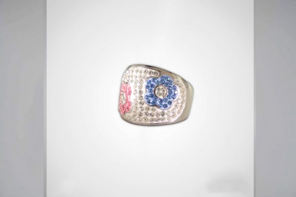 Este encantador anillo de acero inoxidable celebra la feminidad y el color a través de un diseño floral brillante. Decorado con cristales cuidadosamente engastados, presenta dos flores —una rosa y otra azul— que se destacan entre un fondo pavé de cristales blancos. Su forma ancha y superficie brillante lo convierten en una pieza protagonista ideal para complementar un look alegre, fresco y sofisticado.