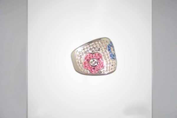 Anillo de acero inoxidable con diseño floral en cristales rosados y azules. Un toque alegre, femenino y moderno para cualquier ocasión.
