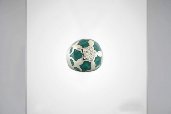 Anillo de acero inoxidable con diseño floral en esmalte azul turquesa y cristales brillantes. Una pieza artística y femenina que resalta con estilo.