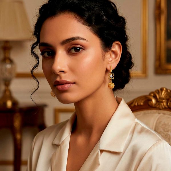 Aretes en oro 18k con flor de cristal y esfera de filigrana calada. Elegancia, brillo y movimiento artesanal perfectos para resaltar tu belleza en ocasiones especiales.