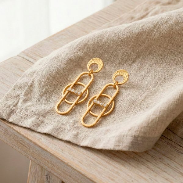 Aretes geométricos enchapados en oro con poste texturizado y aros entrelazados. Una barra de cristales aporta el brillo ideal para un estilo moderno y sofisticado.
