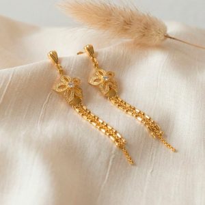 Estos elegantes aretes largos enchapados en oro de 18k combinan lo clásico y lo moderno. Un poste minimalista sostiene una perla luminosa, de la cual desciende una delicada cadena texturizada. El accesorio perfecto para aportar movimiento y sofisticación atemporal a tu look.