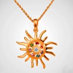 Desde esta gema cuelga un anillo circular adornado con doce cristales blancos de alto brillo, emulando un halo celestial o un disco solar, símbolo de totalidad y perfección. A su vez, tres colgantes trapezoidales móviles decorados con cristales incrustados aportan dinamismo visual, juego de reflejos y un sutil movimiento que ilumina el rostro con cada gesto.