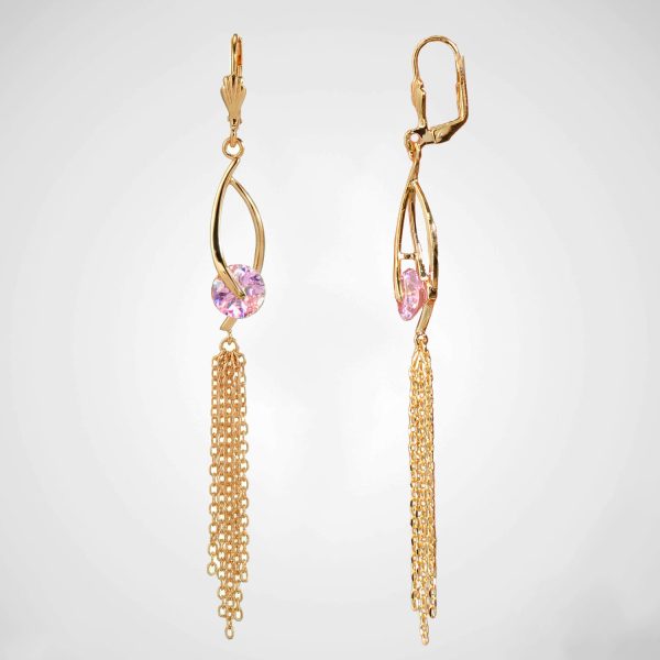 Aretes enchapados en oro de 18K con piedra granate central y cristales brillantes. Diseño colgante articulado de estilo imperial que combina elegancia, geometría y movimiento.