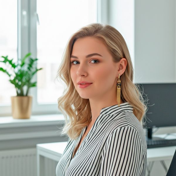Cada elemento ha sido ensamblado con atención al detalle y acabado en baño de oro de 18K, logrando una pieza con presencia escultural y un toque vintage moderno. Su cierre de poste asegura una fijación cómoda y segura, ideal para eventos especiales, galas o para mujeres que desean proyectar poder con un estilo sofisticado.