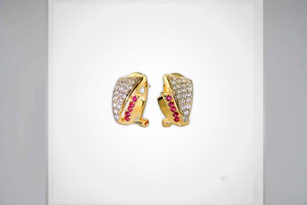 Aretes dorados con circonias rojas y blancas, perfectos para una noche de elegancia y brillo sutil.