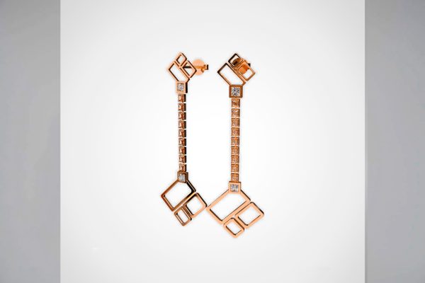 Estos aretes colgantes enchapados en oro de 18k destacan por su diseño contemporáneo basado en formas geométricas cuadradas y líneas limpias. Cada pieza está meticulosamente trabajada con incrustaciones de circonias en corte princesa que brillan con cada movimiento. Perfectos para un look urbano sofisticado o una noche de estilo vanguardista, estos aretes elevan cualquier atuendo con una vibra artística y moderna.