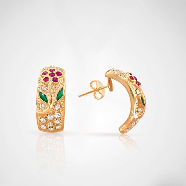 Hermoso arete de la colección Premium con una flor formada de cristales y zircones entre colores rojos, verdes y apariencia de diamantes.