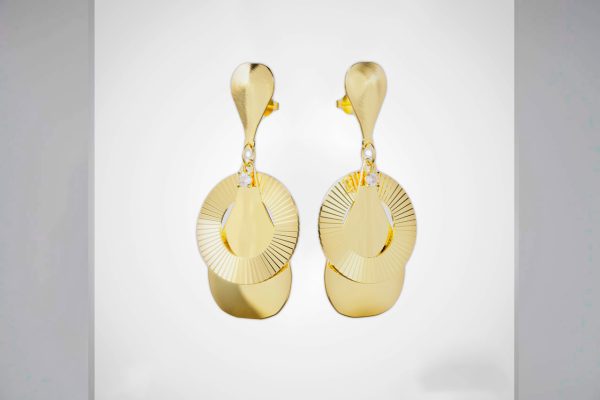 Aretes colgantes dorados con diseño geométrico y brillo elegante. Inspiración solar para un estilo sofisticado.