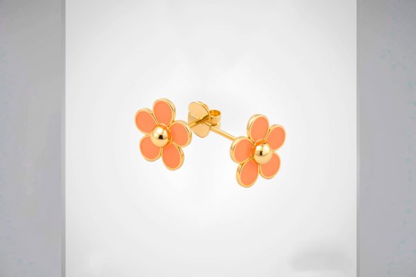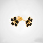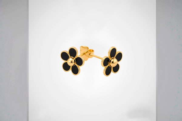 Aretes florales con diseño esmaltado en negro y baño de oro de 18k. Estilo juvenil y elegante.