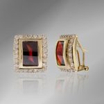Hermosos aretes con piedra rectangular de tono rojizo rodeados de cristales semejando diamantes.