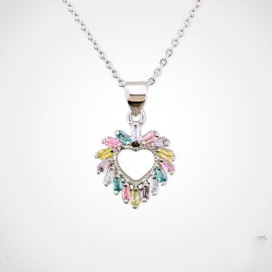 El collar Celestial Drop pertenece a la colección Mystic Garden, una línea inspirada en los símbolos de la naturaleza, la fantasía y la magia de los colores. Este diseño presenta un colgante en forma de gota calada, decorado con cristales multicolor en tonos rosa, azul, verde y violeta que evocan la luz y la diversidad de un jardín encantado. Su estructura está elaborada en acero hipoalergénico enchapado en plata 925, lo que garantiza durabilidad y un acabado brillante. Ideal para quienes desean destacar con un accesorio sofisticado, femenino y lleno de personalidad.