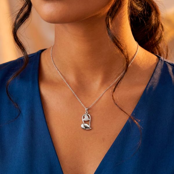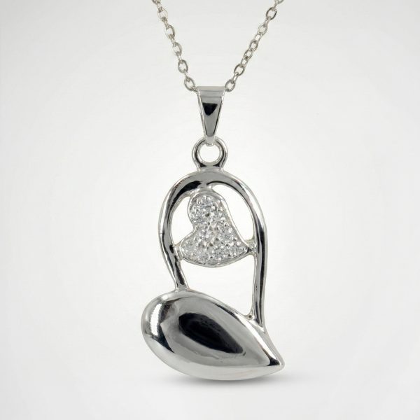 Expresa tu estilo con este sofisticado dije bañado en plata 925. Su diseño presenta una silueta abstracta y fluida en acabado pulido, que acuna en su interior un delicado corazón pavé cortes brillantes. Una joya que combina arte moderno y romanticismo, perfecta para iluminar tu escote con un destello sutil y elegante.