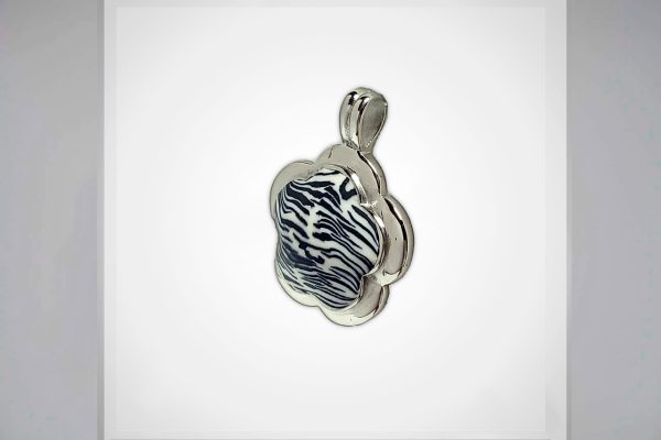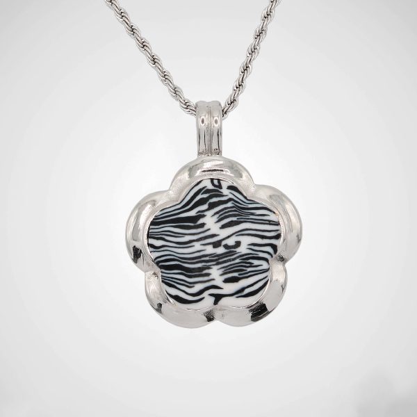Dije en forma de flor de acero inoxidable con diseño tipo cebra. Un toque moderno, salvaje y chic para cualquier look.