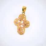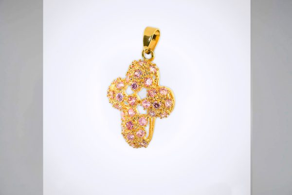 Dije floral enchapado en oro de 18k con piedras rosadas. Un toque romántico y luminoso para cualquier ocasión.