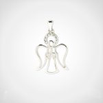 Este delicado dije representa a un ángel en actitud de oración, símbolo de protección, esperanza y guía espiritual. Su diseño calado con líneas suaves transmite una sensación de paz y armonía, mientras que el halo decorado con pequeños cristales añade un brillo sutil y celestial a la pieza.