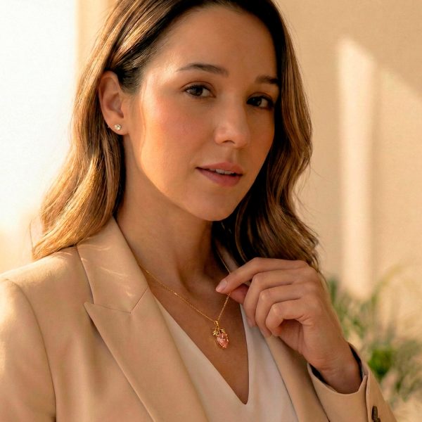 Aporta frescura y un brillo irresistible a tu look con este adorable dije enchapado en oro con forma de fruta. Su diseño combina la calidez del oro con el destello de un circón de alta calidad, disponible en un dulce tono rosa o en un elegante blanco cristalino. Una pieza juvenil, divertida y sofisticada, perfecta para añadir una nota de color y alegría a tu día.