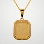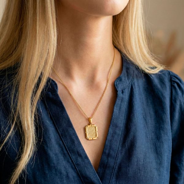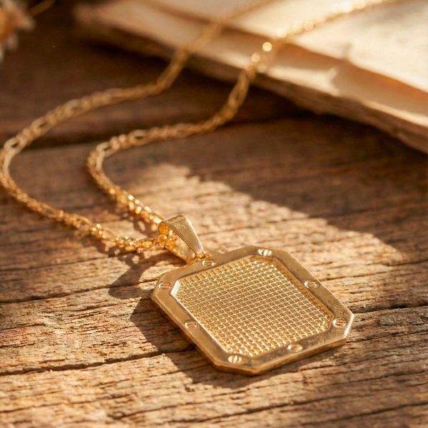 Ríndete al encanto del minimalismo geométrico con este sofisticado dije enchapado en oro. Su diseño de lámina plana destaca por una superficie grid y pulida al alto brillo, que captura la luz de manera espectacular. Es una pieza de estilo contemporáneo, perfecta para quienes buscan elegancia pura o una base ideal para el layering de collares.
