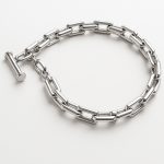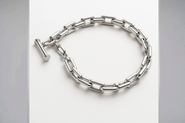 Diseño robusto de eslabones pulidos en acero inoxidable, con acabado brillante y cierre de barra tipo T. Ideal para complementar looks casuales con estilo.