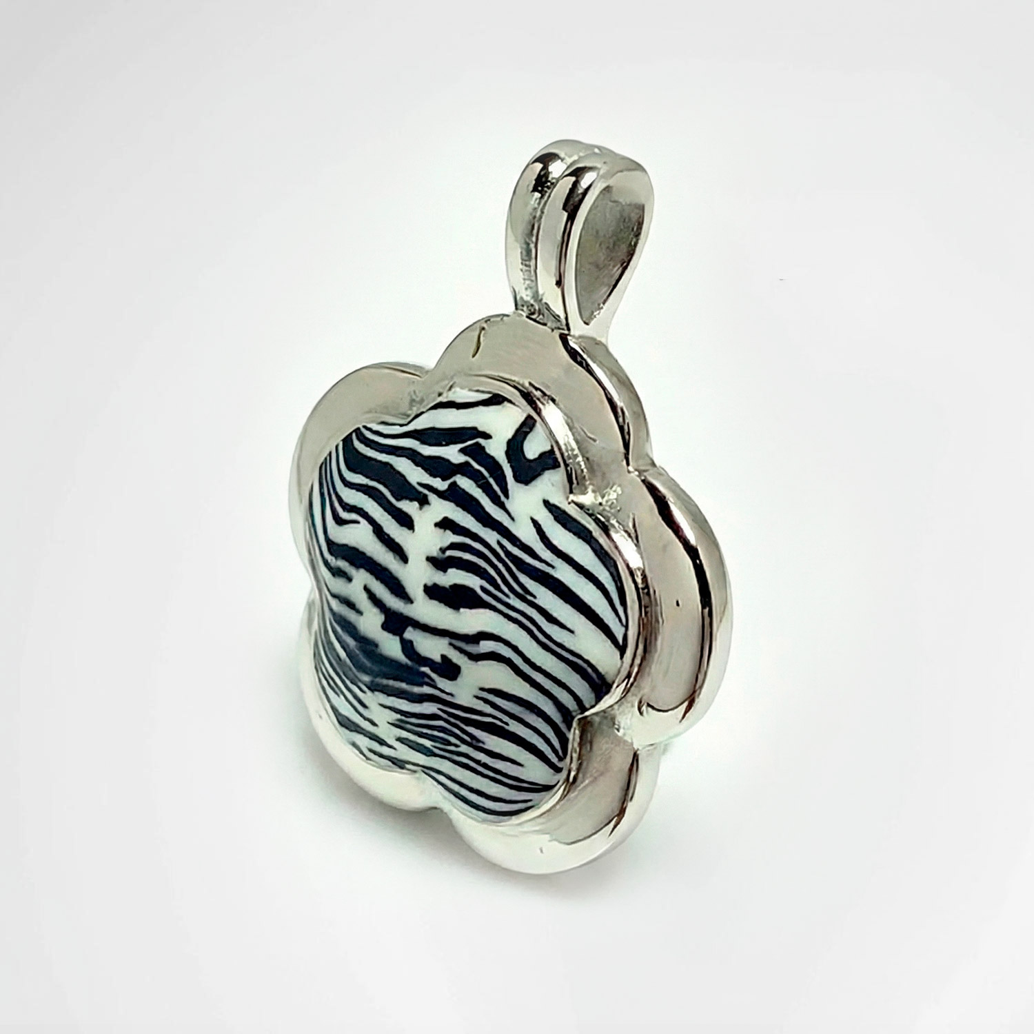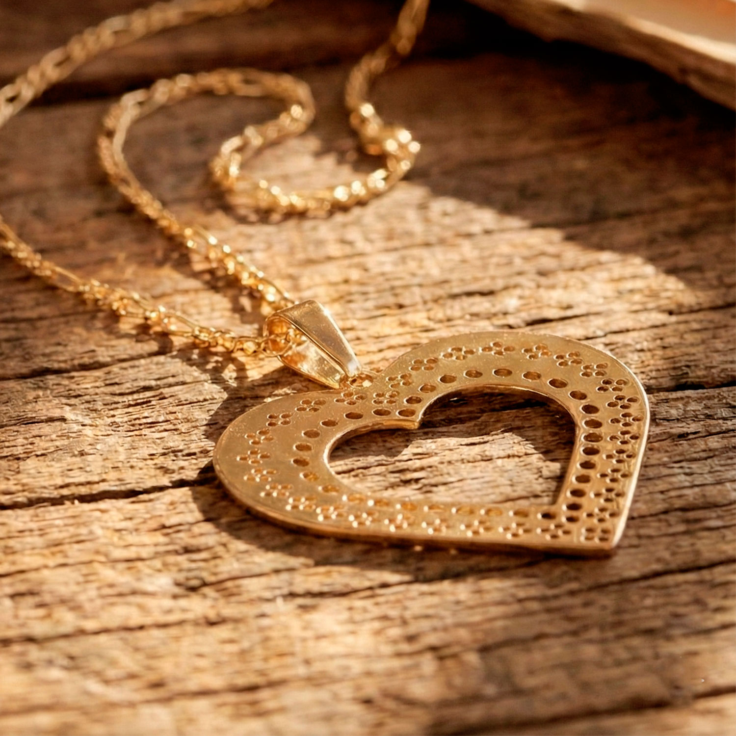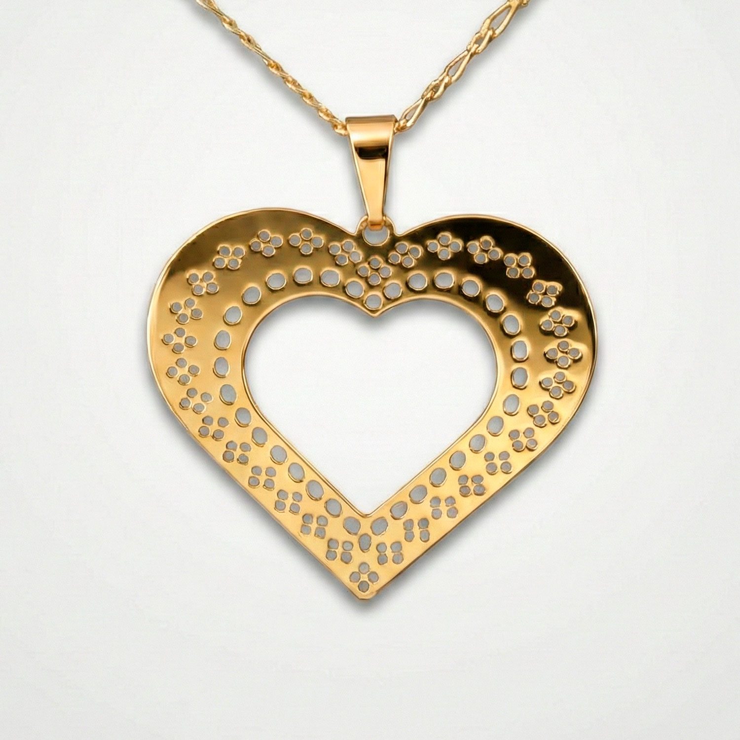 Dije grande de corazón plano con diseño calado moderno. Una pieza audaz y ligera visualmente, perfecta para destacar.