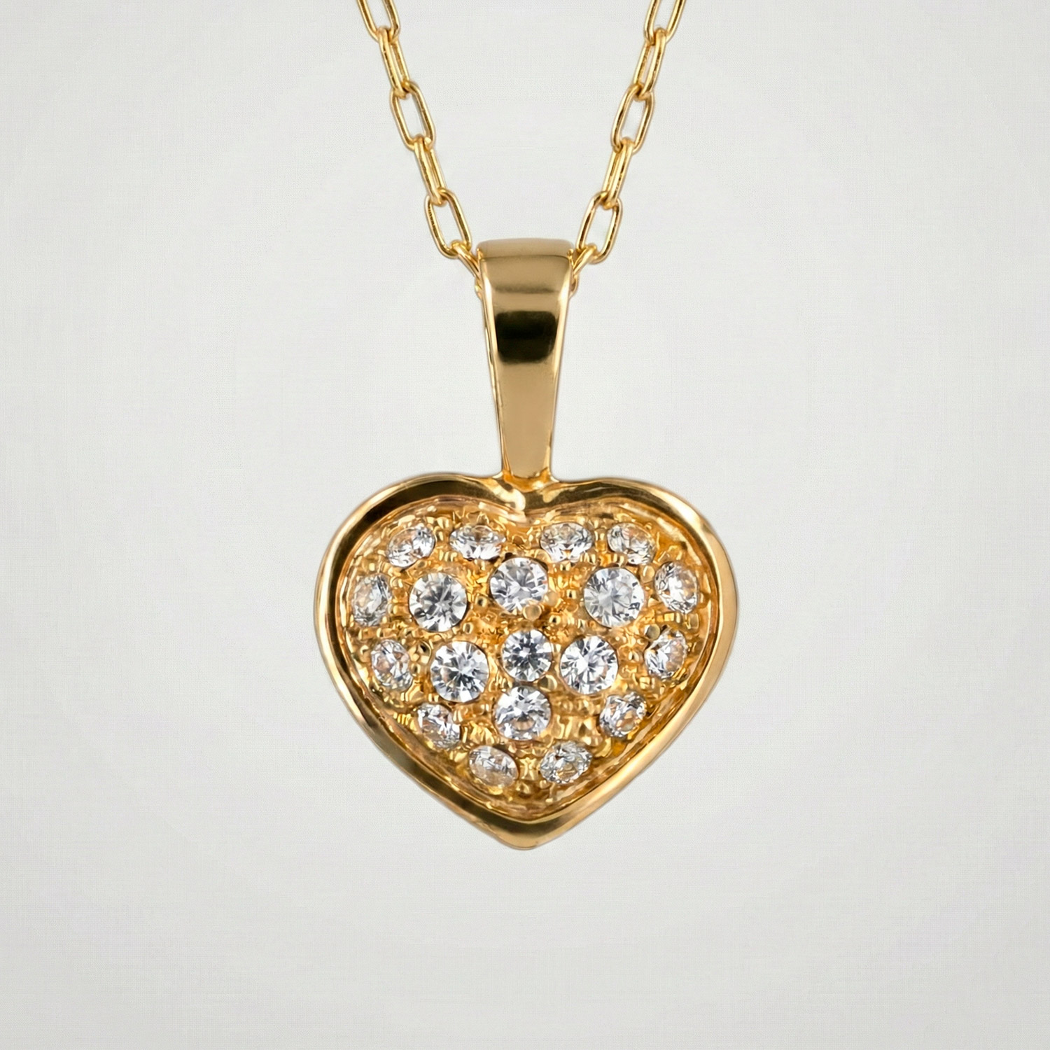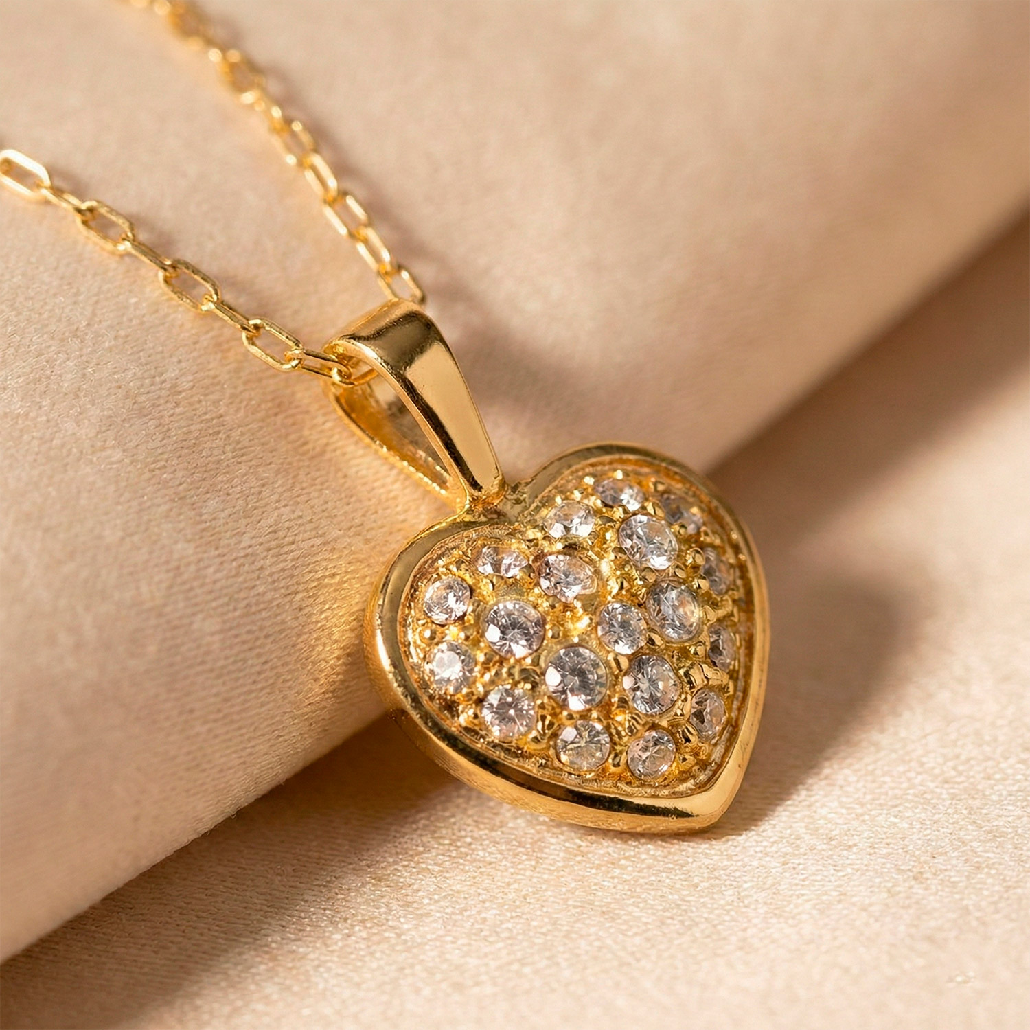 Dije de corazón enchapado en oro con incrustaciones de cristales. Un diseño romántico y muy brillante, ideal para destacar con elegancia.