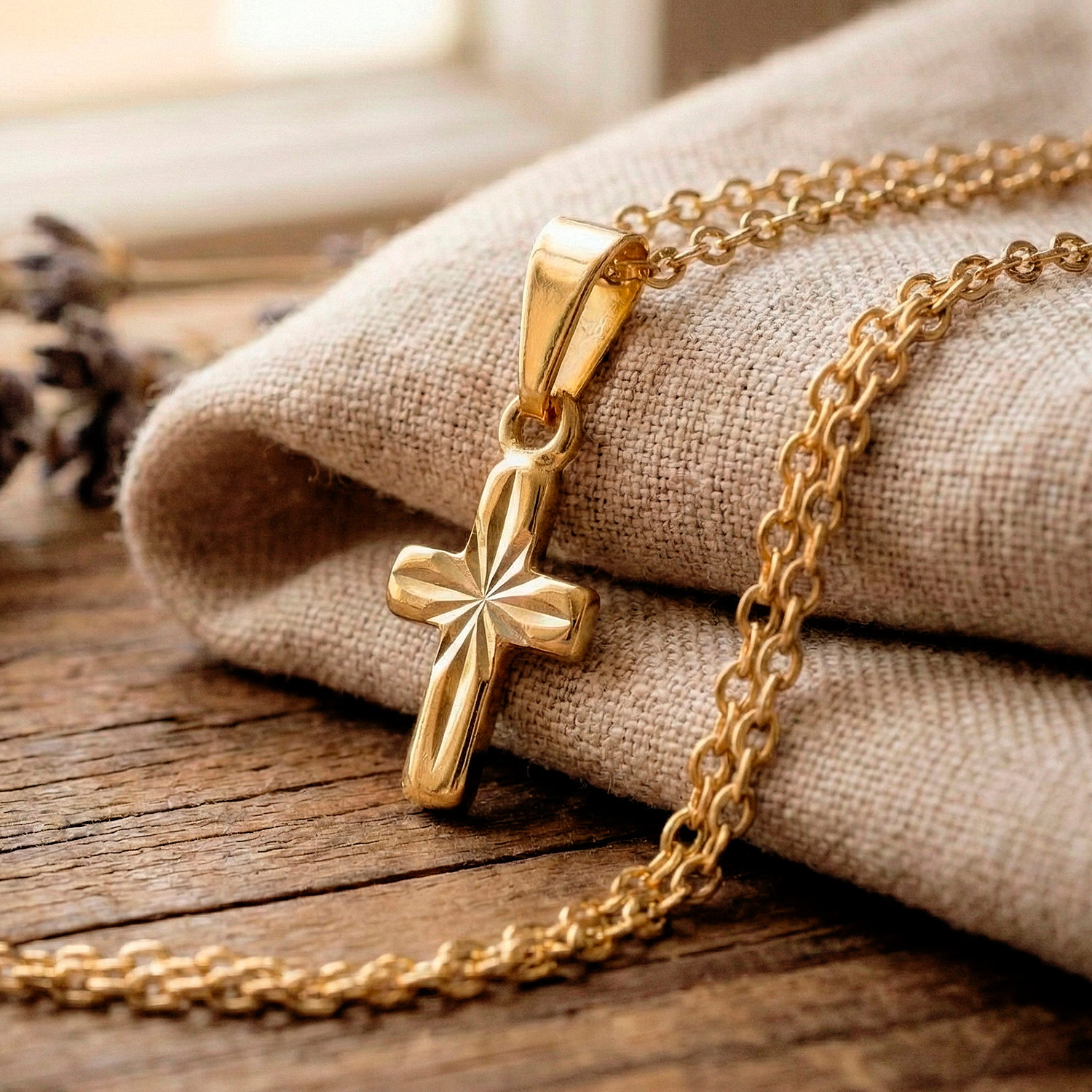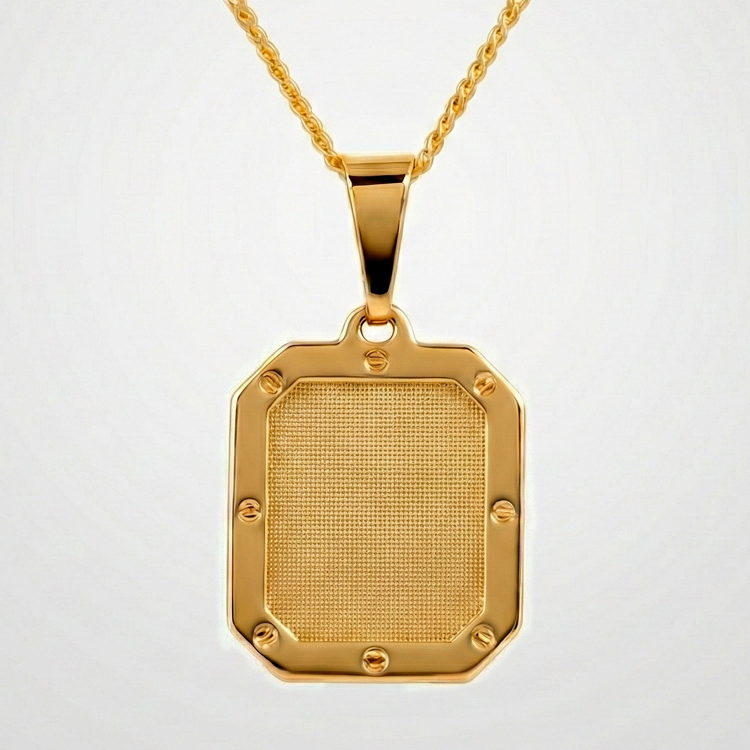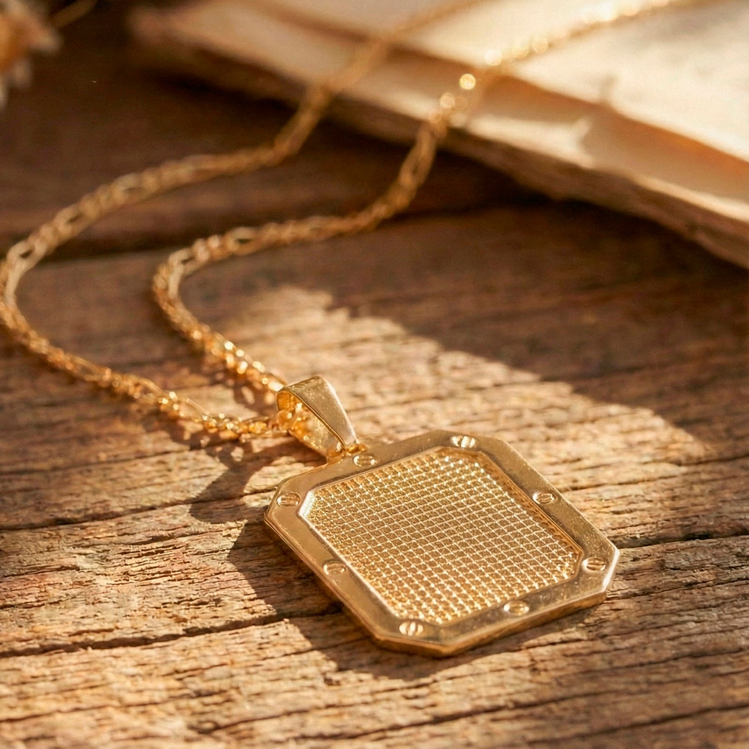 Dije tipo lámina plana enchapado en oro con acabado grid. Un diseño geométrico y moderno que aporta un brillo sofisticado.